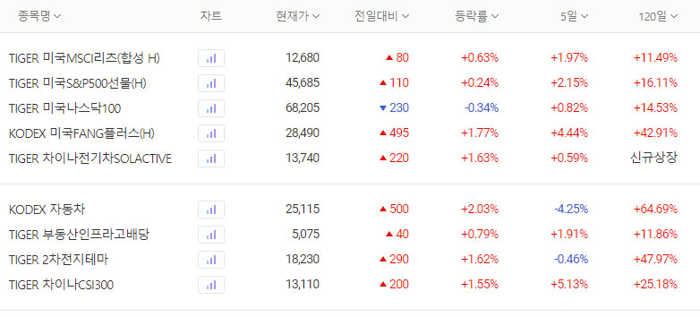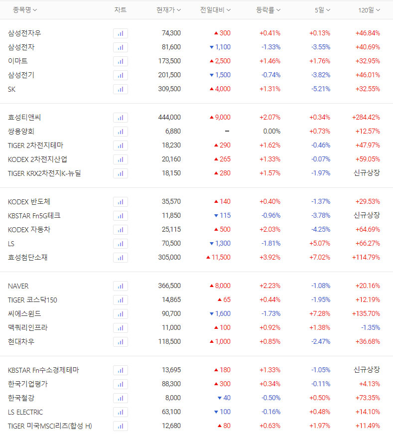 이마트와 SK, 효성티앤씨가 의미있는 상승을 보여주었고, 2차전지 ETF 삼총사도 모두 올랐다. 반도체 ETF 역시 올랐다.