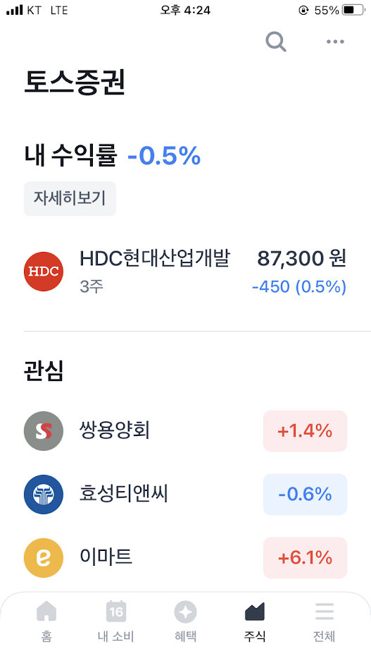 토스증권이 오늘 오픈했다. 계좌 개설을 완료하고, 실험적으로 HDC현대산업개발 주식 3주를 사봤다. 그런데 현재 주가는 보이는데, 내 매수단가(평균단가)는 확인할 수 없는 게 불편하다. 그 외에는 UI가 다른 증권사와 달리 상당히 편리하게 설계된 것 같다.