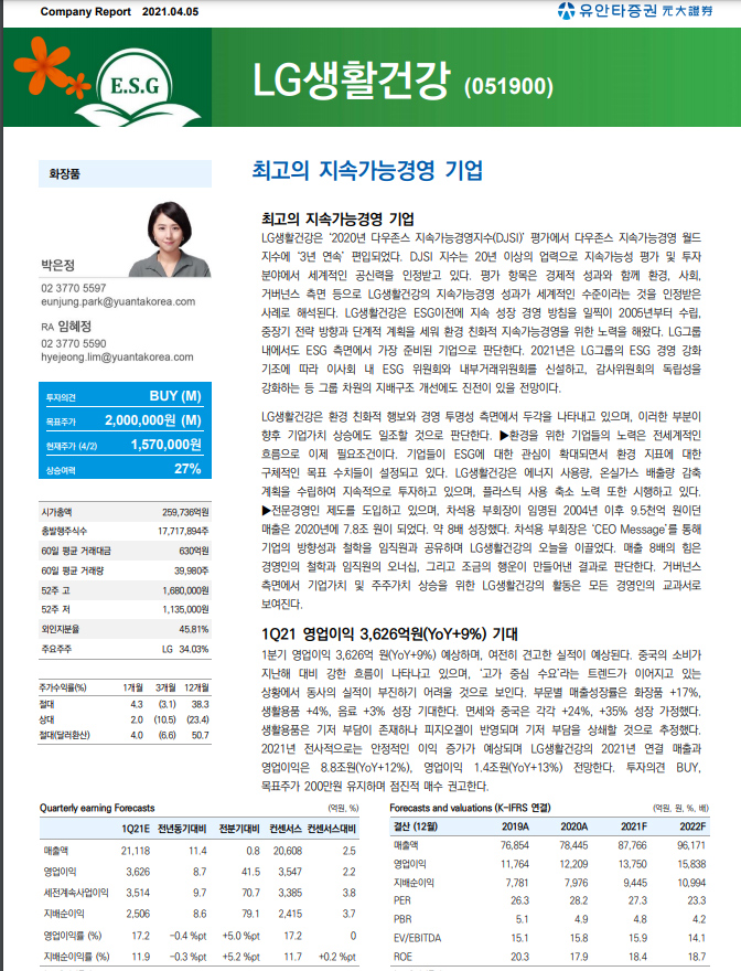 유안타증권 박은정 연구원도 5일 기업 리포트 'LG생활건강 : 최고의 지속가능경영 기업'을 발표했다.