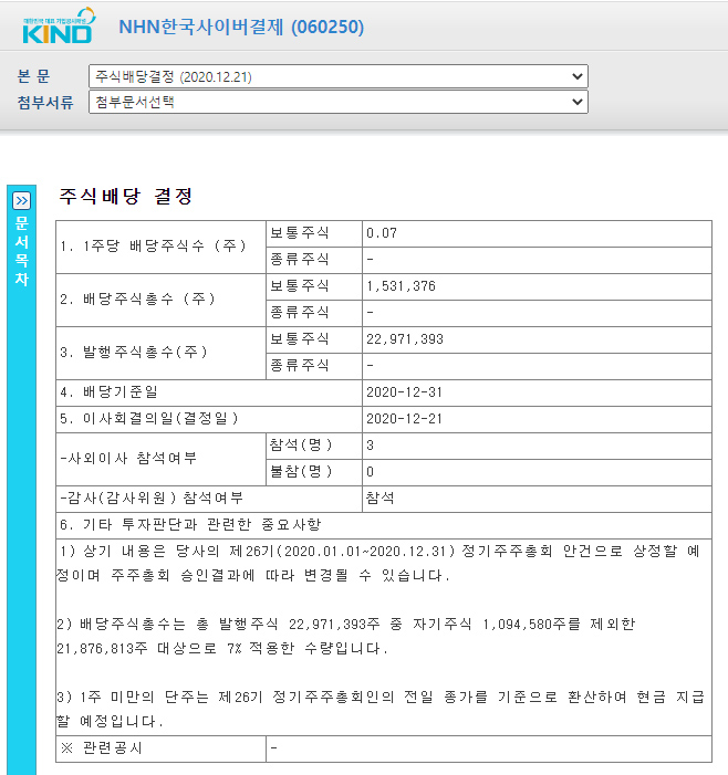 지금은 NHN한국사이버결제 주식은 한 주도 보유하지 않고 있다. 당초 50주 넘게 갖고 있다가 아무래도 고점에 물린 듯 하여, 작년 12월 28일과 올 2월 7일 두 차례에 걸쳐 모두 매각(익절)하였는데, 12월 31일 기준 30주에 대해 주식 2주가 나에게 배당된 것이었다.