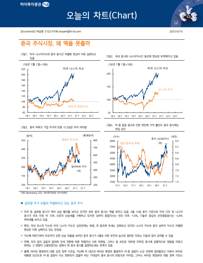 박상현 연구원은 중국정부의 빅테크 기업 규제 강화 등 네 가지 원인을 제시하며 "다소 시간이 걸릴 것"이라고 진단했다. 결론은 당분간 중국증시가 지지부진할 것이라는 말이다.